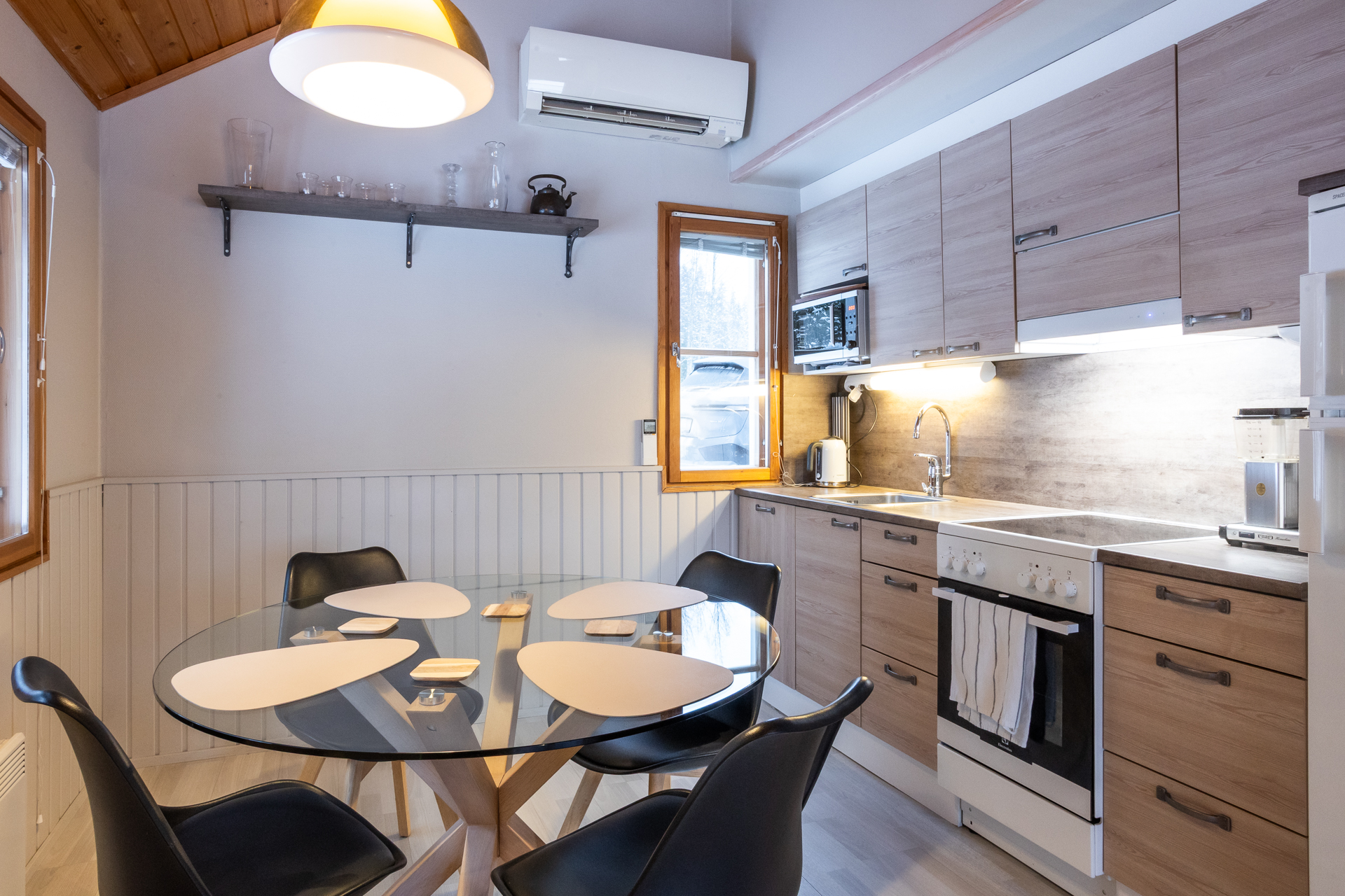 Mökissäsi on täysin varusteltu keittiö, jossa on keraaminen liesi, astianpesukone, jääkaappi/pakastin, pyykinpesukone, mikroaaltouuni, kahvinkeitin, vedenkeitin, hiustenkuivaaja, leivänpaahdin, silitysrauta ja -lauta sekä pölynimuri. Astiat kuudelle hengelle. Tv ja nopea WiFi. Lisäksi mökillä on käytettävissä kaasugrilli ulkogrillausta varten.